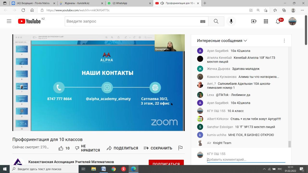 РЕСПУБЛИКАНСКОЕ ОБЩЕСТВЕННОЕ ОБЪЕДИНЕНИЕ "КАЗАХСТАНСКАЯ АССОЦИАЦИЯ УЧИТЕЛЕЙ МАТЕМАТИКИ" организовало прямой эфир для учащихся 10х классов школ г. Алматы. Организаторы ответили на актуальные вопросы учащихся и осветили возможные перспективы для выпускников школ.